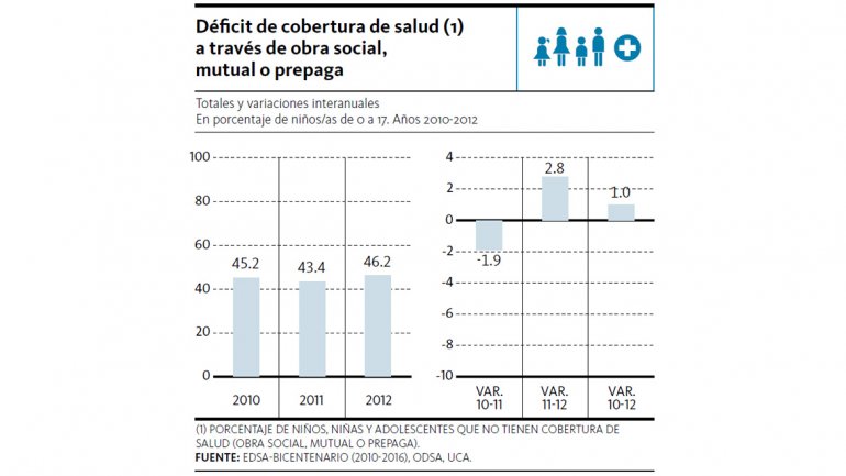 Casi cinco de cada 10 chicos aún carecen de un sistema de cobertura de salud en Argentina, según el último informe Barómetro de la Deuda Social de la Infancia de la Universidad Católica Argentina (UCA). Esta situación, que afecta al 46,2% de los niños y adolescentes en los grandes centros urbanos del país, se refiere a la falta de obra social, mutual o prepaga.