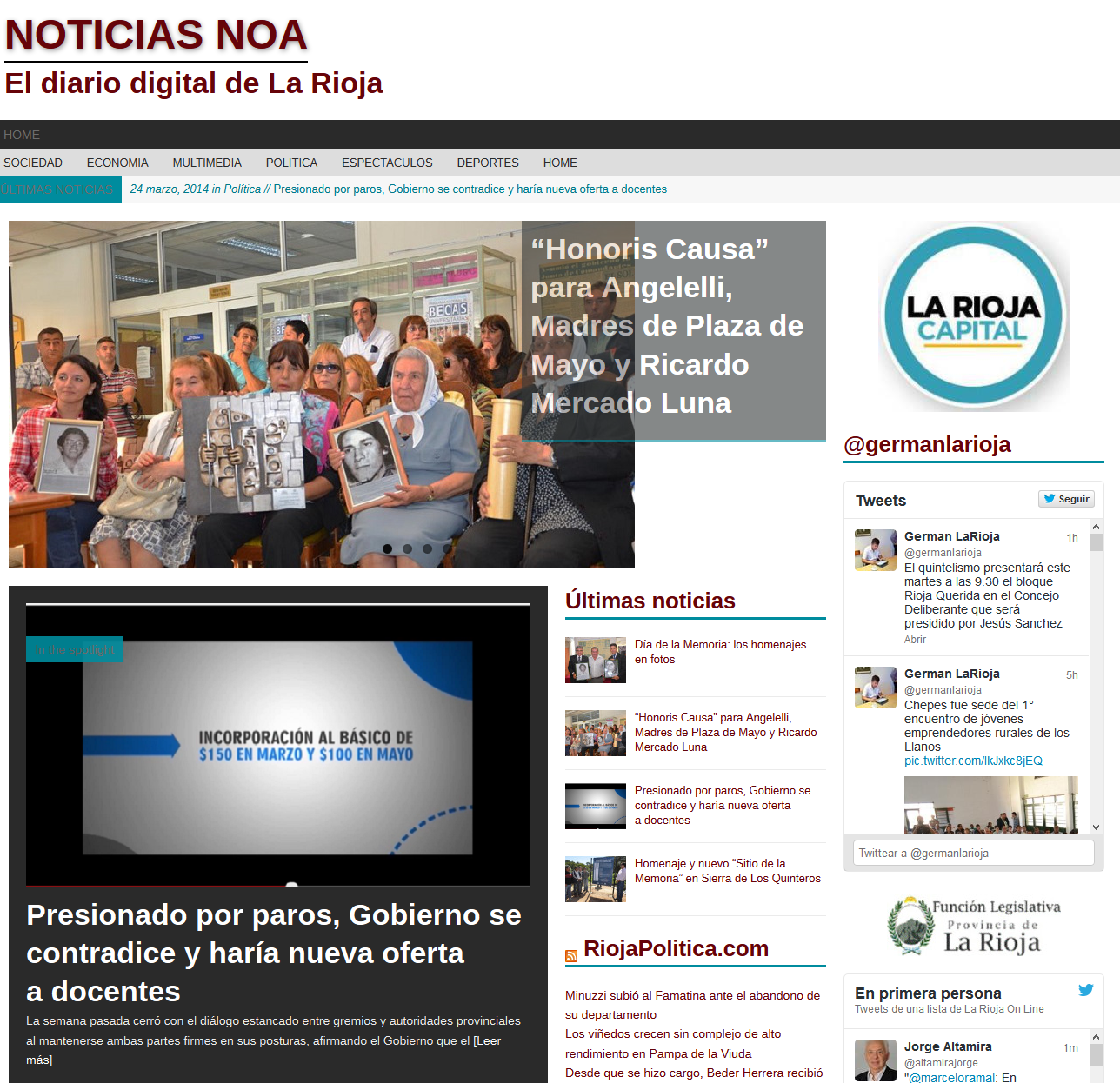 Noticias NOA, el diario digital de La Rioja, presentó este lunes un nuevo diseño en el marco de la reorganización periodística que se está llevando adelante en el Grupo NOA. De esa forma, Noticias NOA apostó por La Rioja mediante otra inversión con el fin de ofrecer un sitio web con distintas temáticas sociales.
