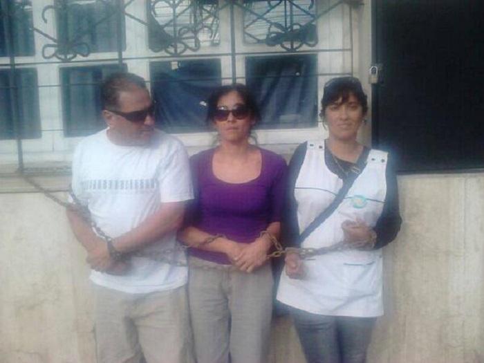 Docentes autoconvocados provenientes de Chilecito, una de las zonas más conflictivas en materia educativa, se encadenaron esta tarde del jueves frente a la sede del Ministerio de Educación.