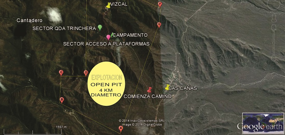 El mismo se encuentra a 15 kilómetros del centro de la ciudad Capital y abarca una superficie de casi mil hectáreas, que abarcan los cerros ubicados entre “La Fazenda» hasta la lancha, donde se construirán caminos y un gran campamento, según consta en el Boletín oficial de la Provincia, afirmaron. Allí se prevé la explotación a cielo abierto, “abriendo en la montaña un open pit (pozo) de 4 km de diámetro, con la consiguiente utilización de explosivos y sustancias toxicas que se utilizara junto al agua de las vertientes de la zona para extraer el uranio de las rocas dinamitadas”.