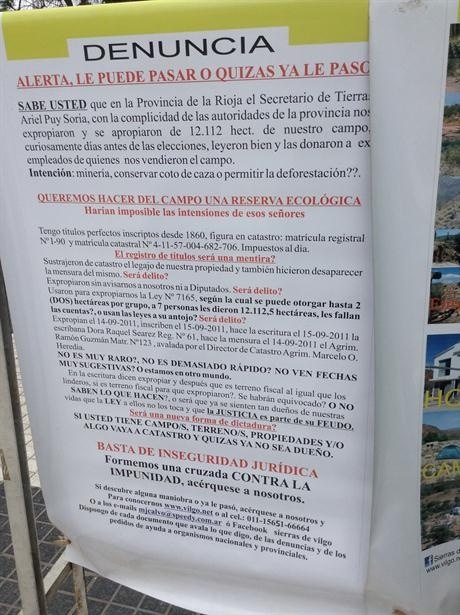 El propietario del emprendimiento Sierras de Vilgo protesta todos los lunes frente a la Casa de Gobierno. Martín Calvo, junto a su familia, denunciaron al gobierno por apropiarse de su emprendimiento. Culpa al secretario de Tierras, Ariel Puy Soria. Dice que se apropió de las 12.112 hectáreas pese a que posee títulos perfectos y mensuras regulares. Calfo aseguró que fueron expropiadas «sin avisar ni a ellos ni a diputados» el 14 de septiembre de 2011 y escrituradas un día más tarde por la escribana Dora Searez. Usaron la ley 7165 que estipula que se puede otorgar hasta 2 hectáreas por grupo, pero que a 7 personas le dieron las 12 mil hectáreas. «¿Será una nueva forma de dictadura?», se preguntó Calvo. El afectado despliega una sombrilla y carteles reclamando por la devolución del emprendimiento turístico al que le «pusieron mucho esfuerzo». Y dio una web para consultas http://www.vilgo.net. y un celular. Tenía intención de hacer una reserva ambiental en los terrenos y esto también se le diluyó.