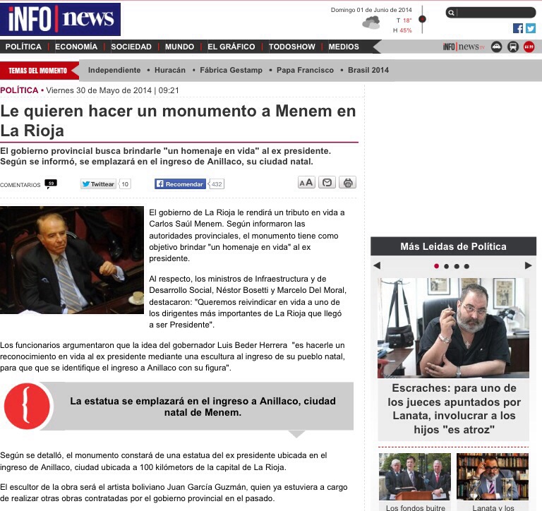 El anuncio del gobierno de Luis Beder Herrera por la construcción de un monumento al ex presidente Carlos Menem tuvo una amplia difusión en todo el país. El monumento se levantará en la localidad de Anillaco y será financiado por la provincia.