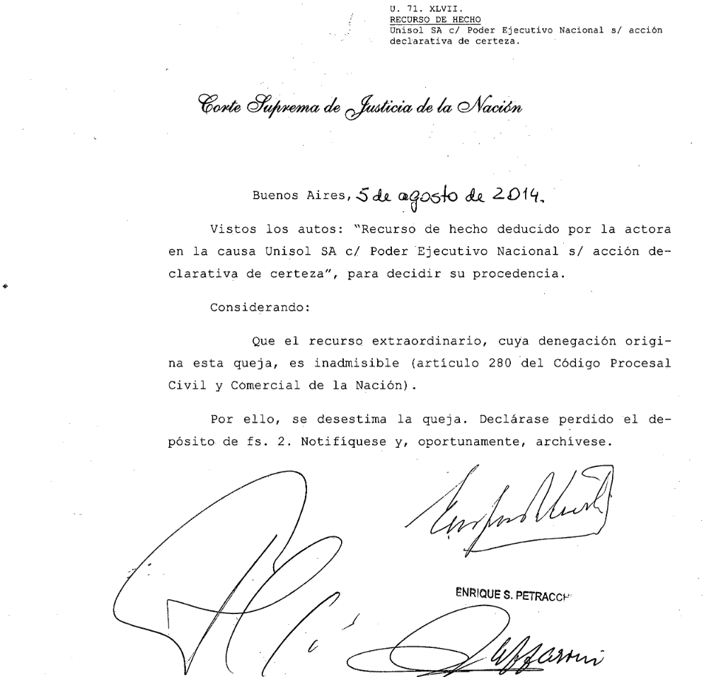 | U. 71. XLVII. RHE | 05/08/2014 | Unisol S.A. | Poder Ejecutivo Nacional | acción declarativa de certeza | REGIMEN IMPOSITIVO |