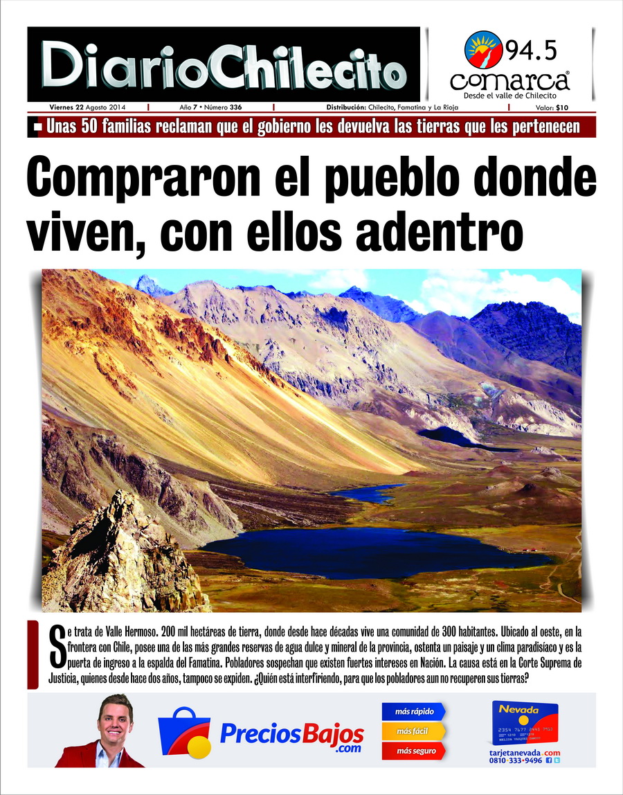 Se trata de Valle Hermoso. 200 mil hectáreas de tierra, donde desde hace décadas vive una comunidad de 300 habitantes. Ubicado al oeste, en la frontera con Chile, posee una de las más grandes reservas de agua dulce y mineral de la provincia, ostenta un paisaje y un clima paradisíaco y es la puerta de ingreso a la espalda del Famatina. Pobladores sospechan que existen fuertes intereses en Nación. La causa está en la Corte Suprema de Justicia, quienes desde hace dos años, tampoco se expiden. ¿Quién está interfiriendo, para que los pobladores aun no recuperen sus tierras?