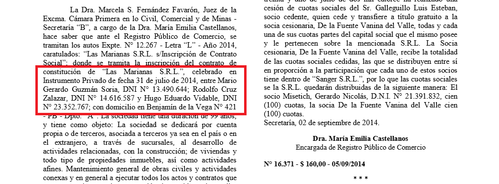 La Dra. Marcela S. Fernández Favarón, Juez de la Excma. Cámara Primera en lo Civil, Comercial y de Minas -Secretaría “B”, a cargo de la Dra. María Emilia Castellanos, hace saber que ante el Registro Público de Comercio, se tramitan los autos Expte. N° 12.267-Letra “L” -Año 2014, caratulados: “Las Marianas S.R.L. s/Inscripción de Contrato Social”; donde se tramita la inscripción del contrato de constitución de “Las Marianas S.R.L.”, celebrado en Instrumento Privado de fecha 31 de julio de 2014, entre Mario Gerardo Guzmán Soria, DNI N° 13.490.644; Rodolfo Cruz Zalazar, DNI N° 14.616.587 y Hugo Eduardo Vidable, DNI N° 23.352.767; con domicilio en Benjamín de la Vega N° 421 -PB -Dpto. “A”.