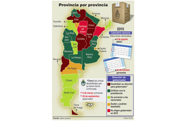 Según Diario Bae, el cronograma de elecciones será mucho más amplio para el 2015, ya que varios distritos decidieron desdoblar e irán separadas de las nacionales. Chaco, Córdoba, Salta, Santa Fe, Tierra del Fuego y Neuquén decidieron adelantarse para elegir gobernador.