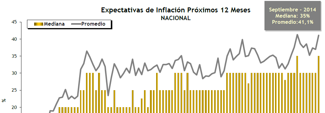En la mediana de las respuestas, la inflación esperada a nivel nacional sube 5 puntos porcentuales y alcanza el registro histórico de 35% en septiembre.