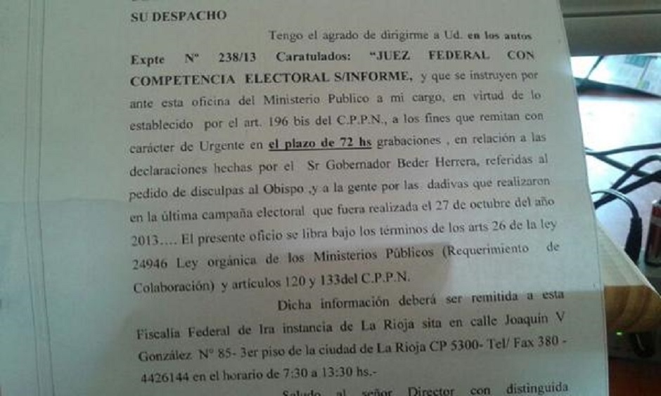 La Justicia Federal avanza en la investigación en torno a presuntas “prácticas clientelares” que fueron reconocidas por el propio gobernador Luis Beder Herrera. Fue tras que la Cámara Nacional Electoral denunció al juez federal de La Rioja Daniel Herrera Piedrabuena ante el Consejo de la Magistratura por su reticencia a investigar.