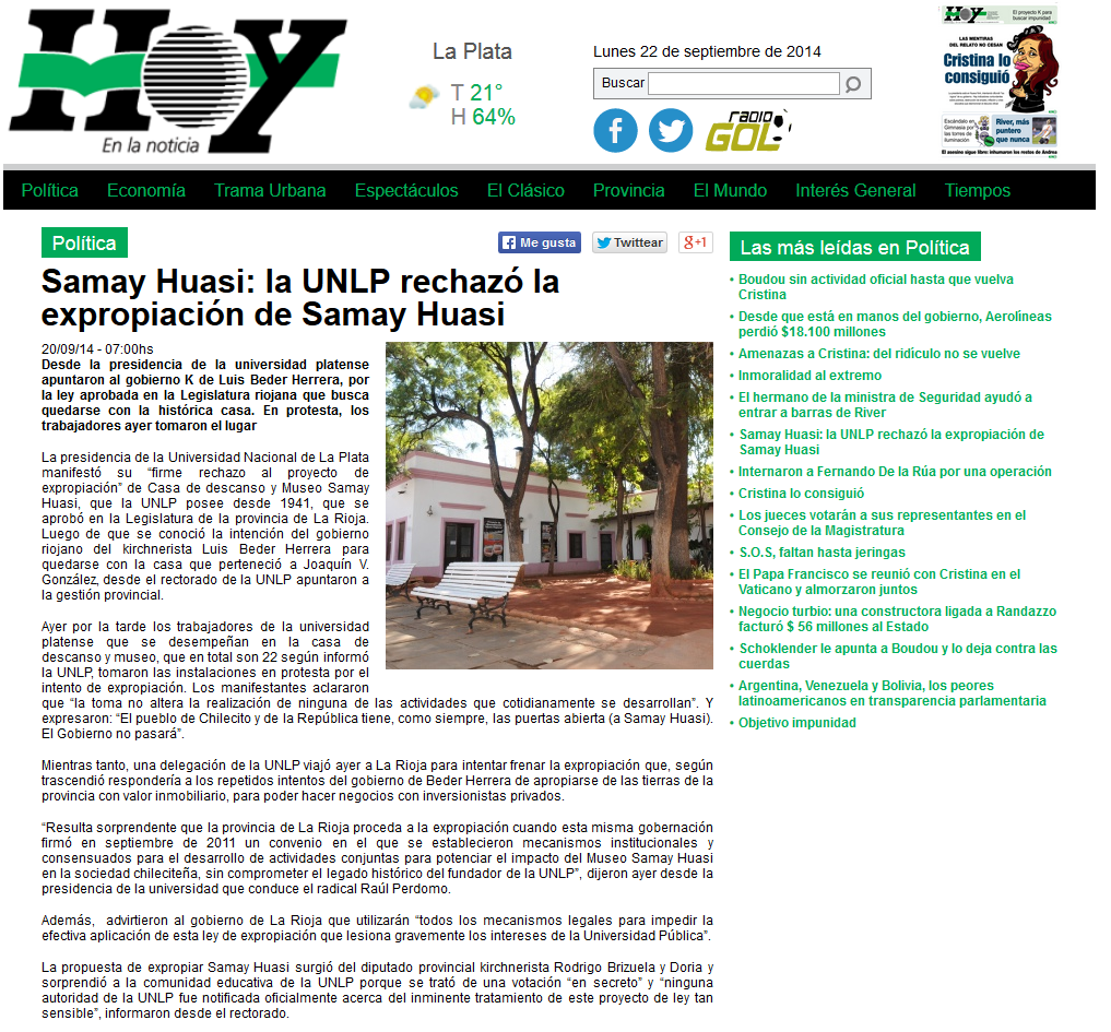 La presidencia de la Universidad Nacional de La Plata manifestó su “firme rechazo al proyecto de expropiación” de Casa de descanso y Museo Samay Huasi, que la UNLP posee desde 1941, que se aprobó en la Legislatura de la provincia de La Rioja. Luego de que se conoció la intención del gobierno riojano del kirchnerista Luis Beder Herrera para quedarse con la casa que perteneció a Joaquín V. González, desde el rectorado de la UNLP apuntaron a la gestión provincial.