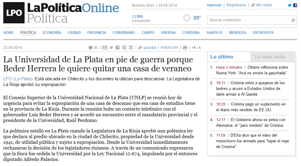El Consejo Superior de la Universidad Nacional de La Plata (UNLP) se reunió hoy de urgencia para evitar la expropiación de una casa de descanso que esa casa de estudios tiene en la provincia de La Rioja. Durante la reunión hubo un contacto telefónico con el gobernador Luis Beder Herrera y se acordó un encuentro entre el mandatario provincial y el presidente de la Universidad, Raúl Perdomo.