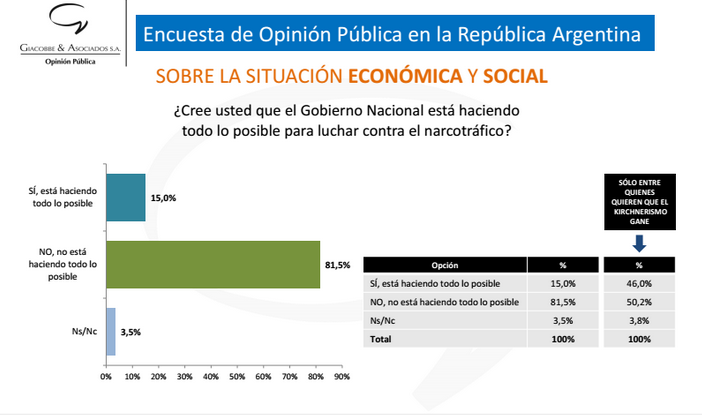 Una encuesta de opinión de Giaccobe & Asociados dejó en evidencia el descontento social que existe con las políticas oficiales para combatir el tráfico de drogas. El trabajo mostró que el 81,5% no cree que se esté haciendo «todo lo posible» para enfrentar ese flagelo, contra el 15% que piensa lo contrario.