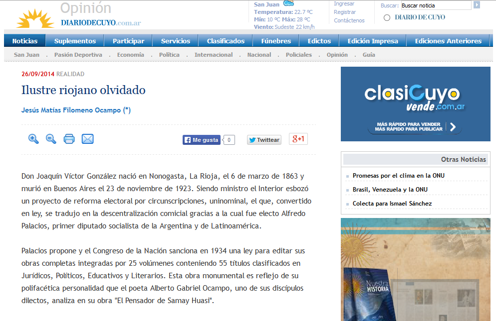 Don Joaquín Víctor González nació en Nonogasta, La Rioja, el 6 de marzo de 1863 y murió en Buenos Aires el 23 de noviembre de 1923. Siendo ministro el Interior esbozó un proyecto de reforma electoral por circunscripciones, uninominal, el que, convertido en ley, se tradujo en la descentralización comicial gracias a la cual fue electo Alfredo Palacios, primer diputado socialista de la Argentina y de Latinoamérica.