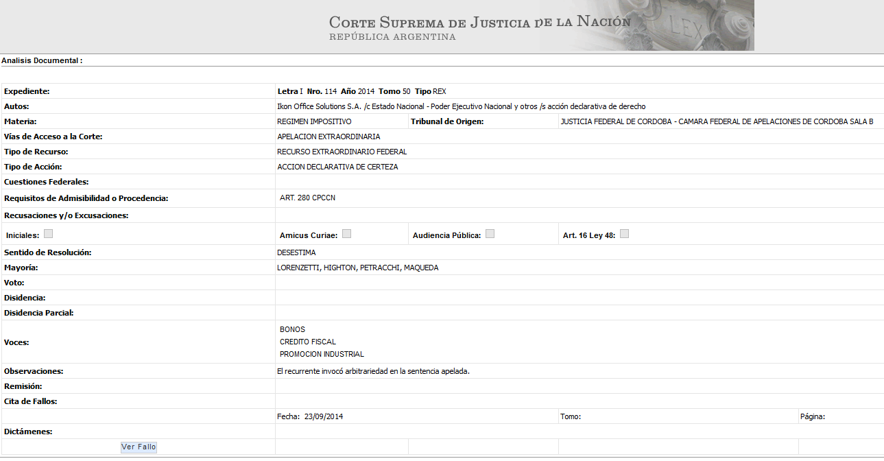La Corte Suprema de Justicia desestimó una demanda de la empresa Ikon Office Solutions S.A. contra el Estado Nacional. Se trata de la causa Poder Ejecutivo Nacional y otros /s acción declarativa de derecho.
