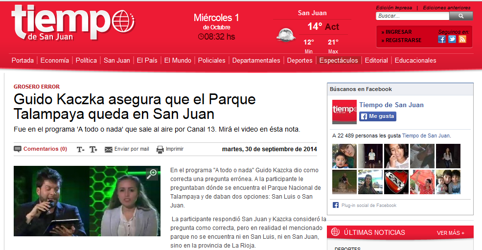 En el programa «A todo o nada» Guido Kazcka dio como correcta una pregunta errónea. A la participante le preguntaban dónde se encuentra el Parque Nacional de Talampaya y de daban dos opciones: San Luis o San Juan.