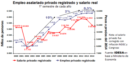 En el año 2014 el salario real está cayendo producto de que la inflación es mayor a los aumentos nominales de las remuneraciones. Esto mitiga el ajuste en el empleo. Se trata de la principal diferencia entre la crisis actual con la de fines de la convertibilidad. Bajo un régimen de convertibilidad, al no poder devaluar y por ende licuar salarios con inflación, el ajuste se canaliza casi exclusivamente en destrucción de empleo. En la situación actual, por el contrario, la inflación y la devaluación llevan a un ajuste que combina disminución más atenuada del empleo privado con caída del salario real.
