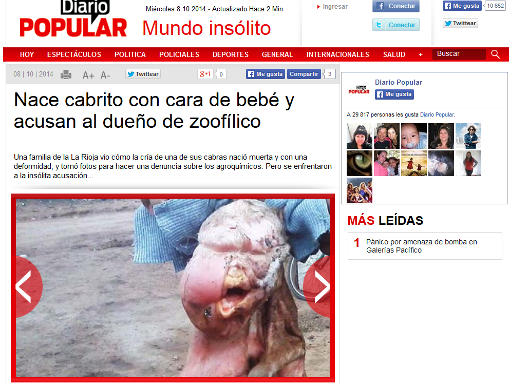 Un extraño momento vive una familia de la provincia de La Rioja, luego de que descubrieran que la cría de una de sus cabras nació con una deformidad semejante a la cara de un bebé. El cabrito murió al ser dada a luz pero la familia decidió, antes de deshacerse del cuerpo, dejar que un amigo de la familia tomara unas fotografías para denunciar las consecuencias del uso de agroquímicos en la zona.