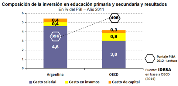 Información recientemente difundida por la OECD (organización que aglutina a los países desarrollados) brinda puntos de referencia que permiten dimensionar los déficits de gestión del sistema educativo argentino. Según la publicación Education at a Glance 2014, el gasto en personal asignado a educación primaria y secundaria tiene el siguiente comportamiento: