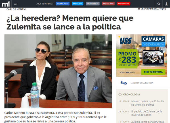 «Si acepta, me va a hacer muy feliz», se entusiamó. Los medios riojanos afirman que la hija del senador aliado al Frente para la Victoria podría postularse a una candidatura para diputada el año próximo. Para Menem, su hija «sí quiere participar». «Ojalá que actúe, yo le veo condiciones. Es una chica inteligente y puede hacer un buen aporte a nuestra causa», se animó.