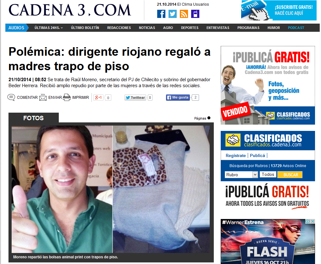 Los habitantes de Chilecito, en La Rioja, se sorprendieron al ver que el sobrino del gobernador Beder Herrera decidió rendir homenaje a las madres de su pueblo entregando un trapo rejilla y otro de piso.