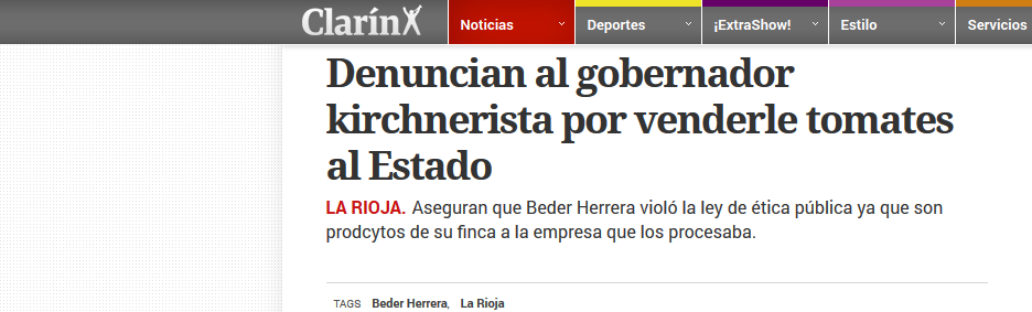 El gobernador Luis Beder Herrera fue denunciado ante la Fiscalía de la ciudad de Chilecito por violar la ley de ética pública, ya que vendía tomates de su finca a la empresa Agroandina, que los procesaba y cuyo capital mayoritario es estatal.