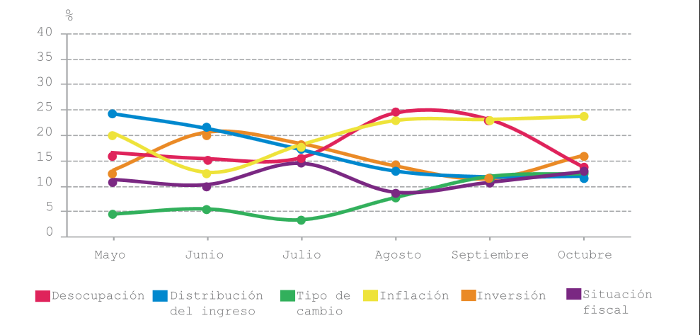 Con guarismos similares a los dos meses anteriores, la Inflación continúa siendo el tema macroeconómico más mencionado en las conversaciones en torno a la política argentina. Se observa una fuerte caída en las menciones a la Desocupación respecto a los meses de agosto y septiembre, mientras que se mantiene la subida de las conversaciones sobre el Tipo de cambio, motivadas por las variaciones en la cotización del dólar.