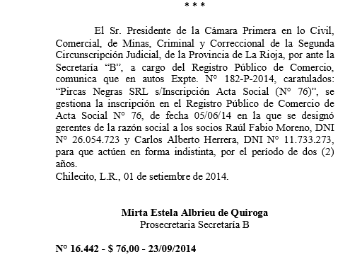 “Pircas Negras SRL s/Inscripción Acta Social (N° 76)”, se gestiona la inscripción en el Registro Público de Comercio de Acta Social N° 76, de fecha 05/06/14 en la que se designó gerentes de la razón social a los socios Raúl Fabio Moreno, DNI N° 26.054.723 y Carlos Alberto Herrera, DNI N° 11.733.273, para que actúen en forma indistinta, por el período de dos (2) años.