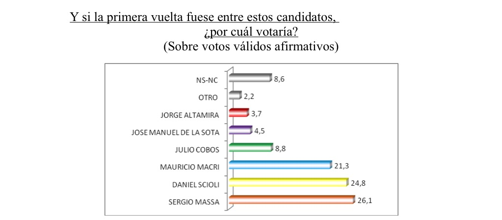 En escenario de primera vuelta, el triple empate registrado en septiembre se ha convertido en un doble empate entre Massa y Scioli, con una ligera preeminencia de este último.