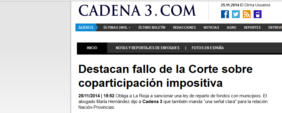 En diálogo con Cadena 3, María Hernández dijo: “El fallo es muy importante, porque se le ordena a la Provincia que sancione de inmediato una la ley convenio de coparticipación impositiva, en cumplimiento de las Constituciones provincial y nacional”.