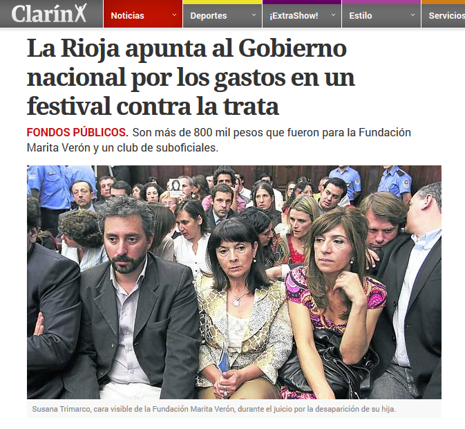 La fundación Marita Verón es presidida por su madre Susana Trimarco, que hace años busca a su hija introducida y hasta ahora desaparecida en una red de prostitución, con origen en Tucumán y vinculaciones con La Rioja. Un tribunal tucumano encontró inocentes a los involucrados, muchos de ellos riojanos, pero el Tribunal Superior de Justicia de esa provincia, revocó ese fallo y en poco tiempo más se realizará un segundo juicio.
