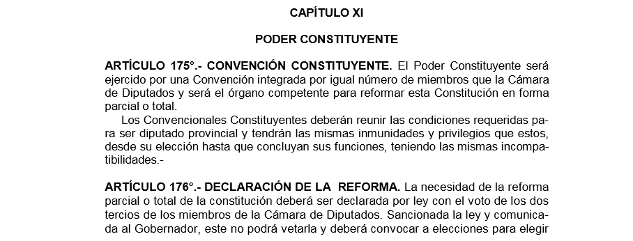La necesidad de la reforma parcial o total de la constitución deberá ser declarada por ley con el voto de los dos tercios de los miembros de la Cámara de Diputados. Sancionada la ley y comunicada al Gobernador, este no podrá vetarla y deberá convocar a elecciones para elegir los Convencionales Constituyentes de acuerdo a lo establecido en esta Constitución y en la ley.