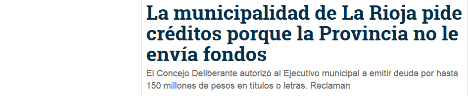 La Municipalidad de la ciudad de La Rioja fue autorizada a tomar hasta 165 millones de pesos en crédito para cubrir sus problemas financieros y denunció al Gobierno provincial de Luis Beder Herrera por no enviar los fondos que le corresponden ni sancionar la Coparticipación Municipal.