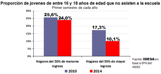 La deserción escolar tiene particularidades. Una de ellas es que se concentra al final del nivel medio, es decir, cuando los alumnos tienen entre los 16 y 18 años de edad. Según el Ministerio de Educación de la Nación en el año 2012 –último disponible– en los tres años finales de la educación media, la matrícula cae un 37% respecto a los tres primeros años de la secundaria. Procurando atacar este problema, a finales del año 2009 se establece la Asignación Universal por Hijo (AUH). Un punto clave del diseño es que el cobro de la prestación está condicionado a la concurrencia del joven beneficiario a la escuela.