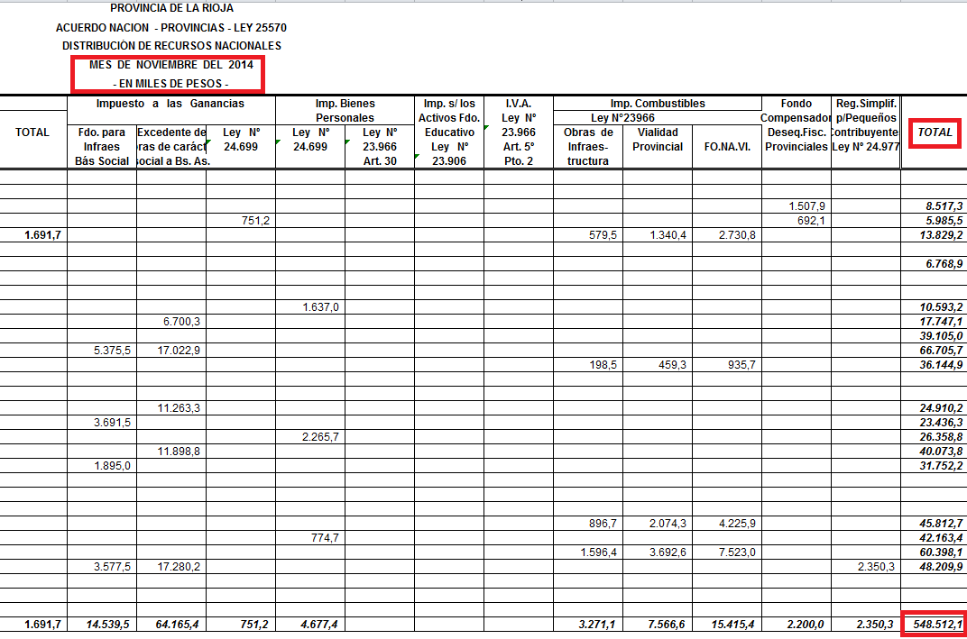 La Rioja tuvo otro mes récord en concepto de coparticipación federal. Del 1 al 30 de noviembre, la administración gubernamental recibió $548.512.100 por recursos coparticipables, mientras que de esos fondos, $403.359.200 son de libre disponibilidad.
