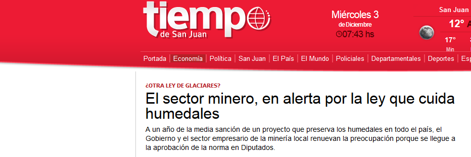 En San Juan lo califican como «peor que la Ley de Glaciares” y se preguntan cómo, hace justamente un año con apoyo de los senadores sanjuaninos, obtuvo media sanción en la Cámara alta. Se trata del proyecto de Ley de Humedales, que intenta fijar los presupuestos mínimos para la conservación, protección y uso racional y sostenible de los humedales. En el Ministerio de Minería local y en el sector empresario minero sanjuanino hay preocupación porque esta iniciativa se convierta en ley porque afecta la realización de actividades en la cordillera como el desarrollo minero.