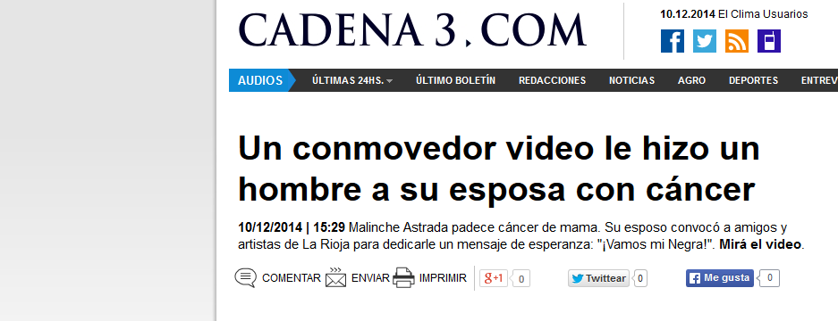 Una joven bailarina que padece cáncer recibió una muestra de afecto de su marido y varios artistas de La Rioja, que realizaron un video para darle fuerza en este difícil momento.
