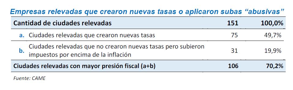 Según un relevamiento realizado por CAME en 151 municipios del país, en 75 de ellos se introdujo alguna tasa o contribución nueva en los últimos 3 años. O sea, en una de cada dos ciudades. A esas nuevas contribuciones se suma que 30 de esas 75 ciudades simultáneamente subieron sus tasas vigentes por encima de la inflación, generando presión fiscal por doble vía: más tasas y subas abusivas en las contribuciones vigentes.