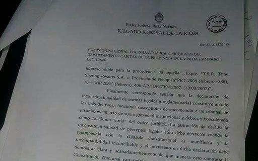 «Es una una resolución de una causa que inicia la Comisión Nacional de Energía Atómica (CNEA) contra la municipalidad, cuando ellos hacen la clausura preventiva en 2013, inician una acción de amparo con medida cautelar, esta sale primero porque es provisoria hasta que se resuelve lo definitivo, a fines del 2013 sale la resolución de la cautelar y resuelve suspender la aplicación de la ordenanza que prohíbe la actividad nuclear» explicó Marisa Romero, representante de la Asamblea Riojana Capital.
