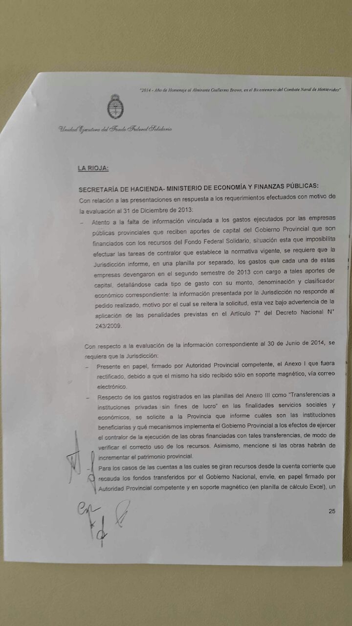 Por ello, el Palacio de Hacienda, a través de la Unidad Ejecutora del Fondo Federal Solidario, solicitó que la Provincia rinda cuenta de los millones de pesos girados por la Nación.
