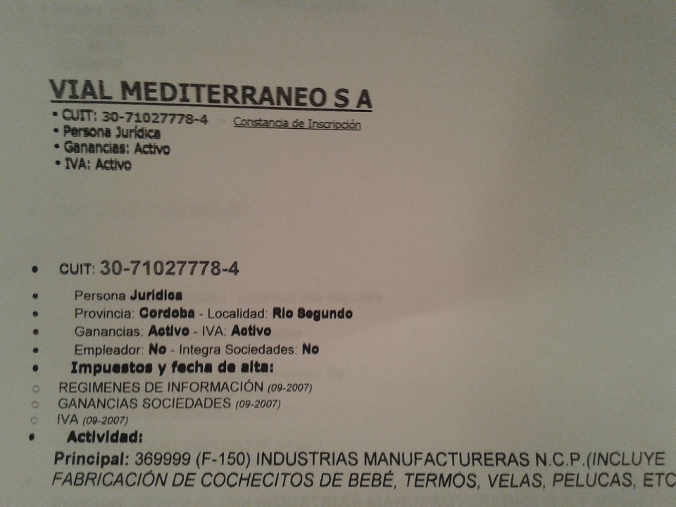 Vial Mediterráneo y Máster Vial tienen domicilio legal en la localidad cordobesa de Rio Segundo, en donde la actividad está declarada en la AFIP, pero tienen el CUIT suspendido.