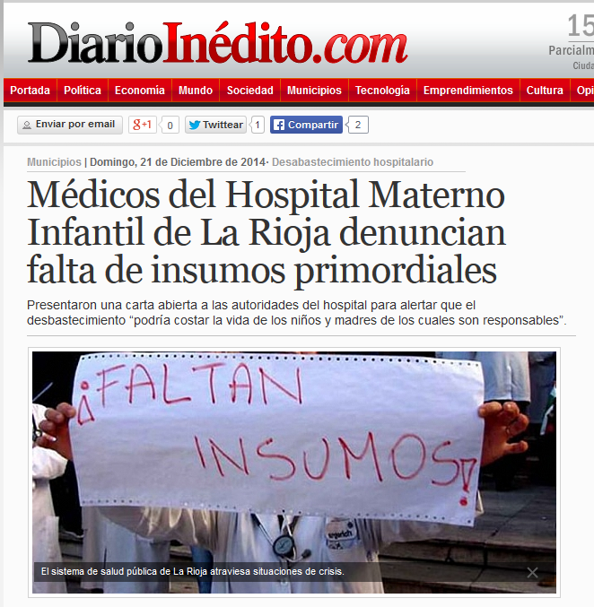 Médicos del hospital materno infantil de La Rioja denunciaron la «falta de insumos primordiales» en ese centro asistencial y advirtieron que el desabastecimiento hospitalario «podría costar la vida de los niños y madres de los cuales somos responsables».