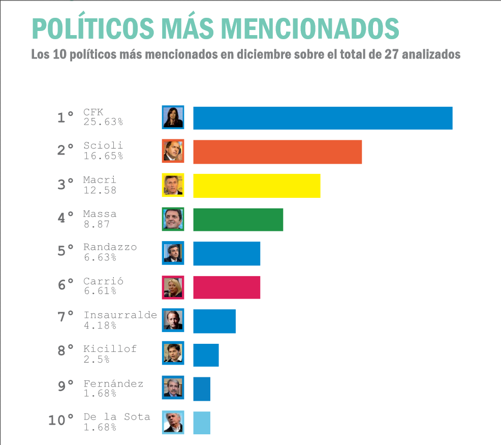 A lo largo de todo el mes de diciembre, CFK se mantuvo como la dirigente más mencionada, dominando cada una de las semanas con registros muy superiores a quienes le siguen. Daniel Scioli tuvo sus mejores desempeños en la primera semana de diciembre, a parir de actos políticos y presencia en programas televisivos y en los primeros días del 2015, por la fuerte repercusión que tuvo su visita al Espacio Clarín en Mar del Plata.