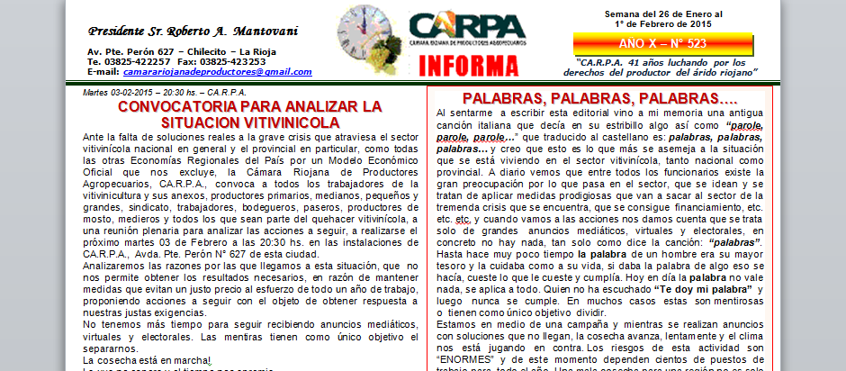 Desde la Cámara Riojana de Productores Agropecuarios (CA.R.P.A) a través de un comunicado apuntaron a que: “El tiempo se acabó. Los productores y toda la industria vitivinícola necesitan respuestas urgentes”.