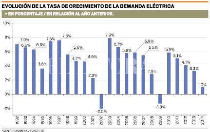 Su serie 1992-2014 muestra que a cada etapa de recesión económica le corresponde una baja en la demanda de la energía. En esos 14 años hubo cifras más bajas que el año pasado sólo en dos casos: -2% en 2002 y -1,3% en 2009.