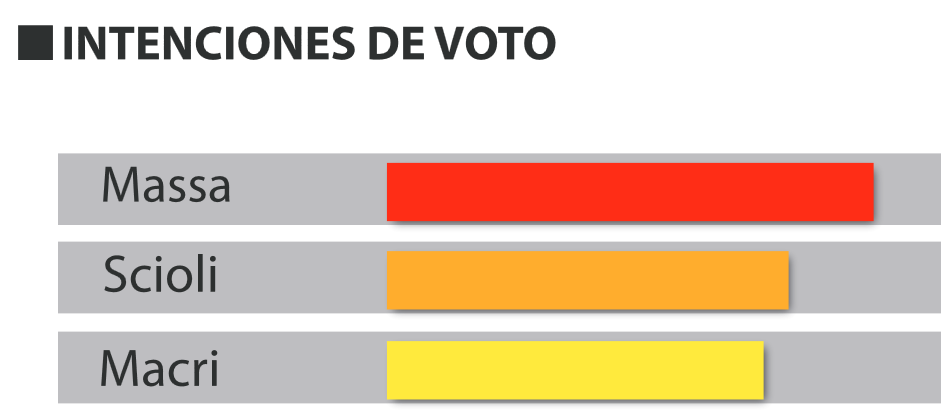 Según ese sondeo, Massa aventaja por más de cinco puntos a Scioli, que mide un 25,1% y por más de 7 a Macri, que queda en tercer lugar con un 23,1%. Por su parte, Cobos en esta última medición alcanza el 10,6% de los votos.