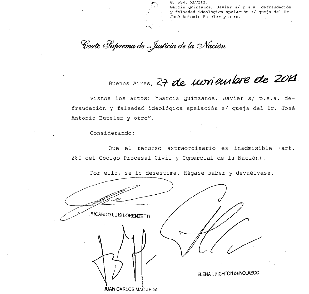 La Corte Suprema de Justicia desestimó un recurso de queja de un hombre acusado por la venta irregular de tierras en la provincia. Se trata del presunto vendedor de tierras de la localidad cordillerana de Valle Hermoso, Javier García Quinzaños, sobre quien recayó una nueva denuncia penal por fraude.