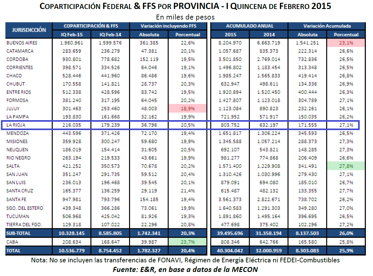 En valores absolutos, los fondos girados a provincias se ubicaron en $10.260 millones, unos $1.722 millones más que en Febrero 2014, aunque un 15% por debajo de lo transferido en la I Quincena de Enero 2015 (-$1.812 millones).