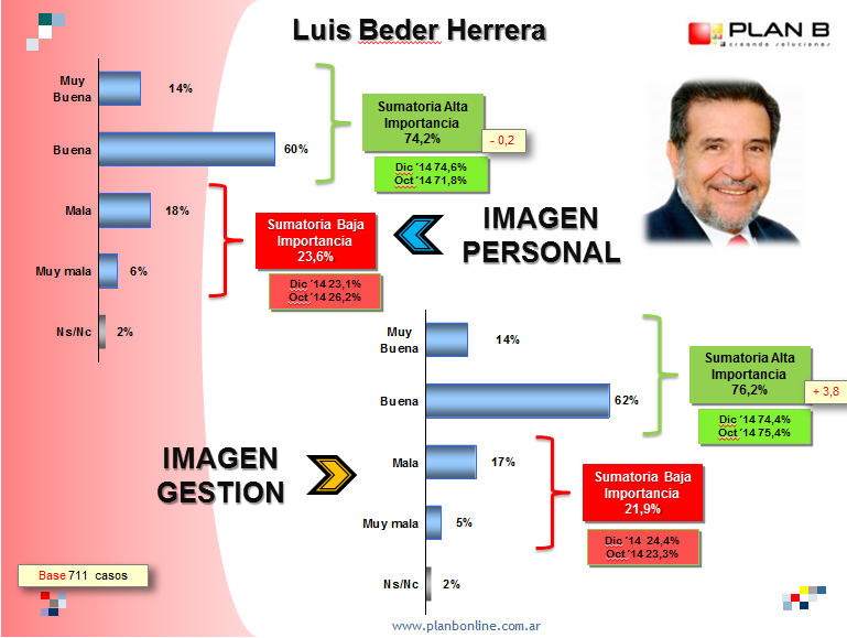El gobernador Luis Beder Herrera aparece con el 74% de imagen positiva, como así también de su gestión, según un sondeo de opinión realizado por la consultora Plan B. En la oportunidad también se brinda una percepción de los principales referentes políticos de la provincia.