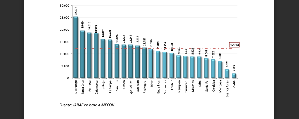 En el otro extremo se ubica la Ciudad de Buenos Aires donde sus habitantes recibieron ingresos 13 veces menor ($1.895 per cápita), mientras que en otros casos las diferencias también fueron importantes, como por ejemplo Buenos Aires, (6,94 veces menos), Mendoza (3,65 veces menos) y Córdoba (3,30 veces menos).