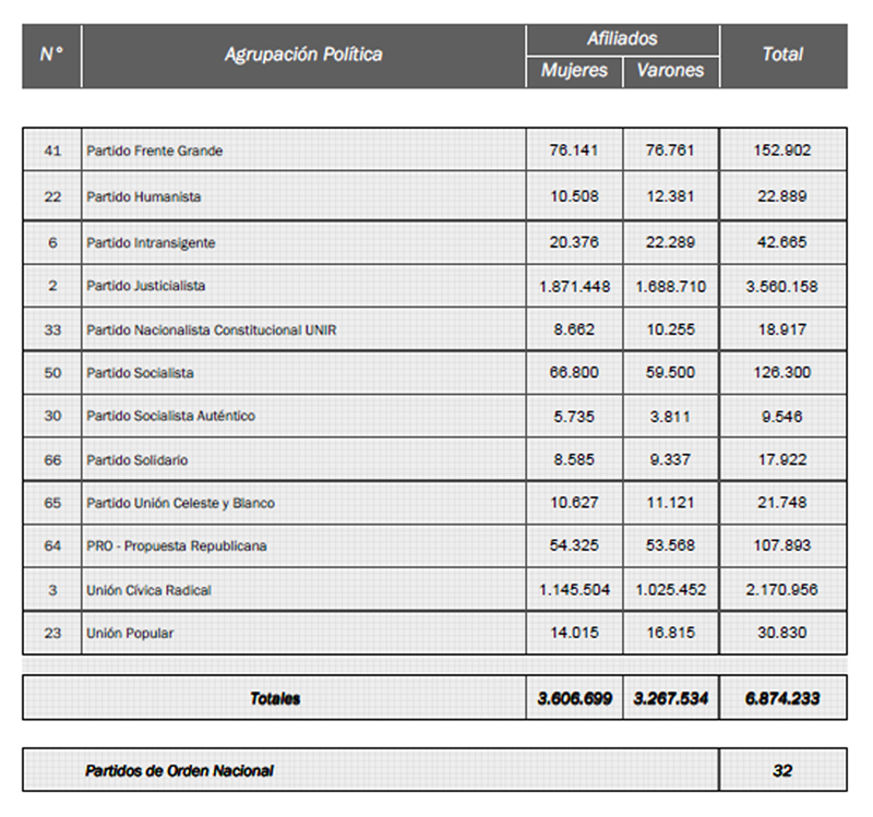 Con 3,5 millones de afiliados, el Partido Justicialista es la fuerza con mayores fichas de afiliación, seguida de cerca por el radicalismo con 2,2 millones. Ambas, son las únicas fuerzas que territorialmente cubren todo el país lo cual aún marca uno de los últimos rasgos de la tradición bipartidista que caracterizó a la Argentina.