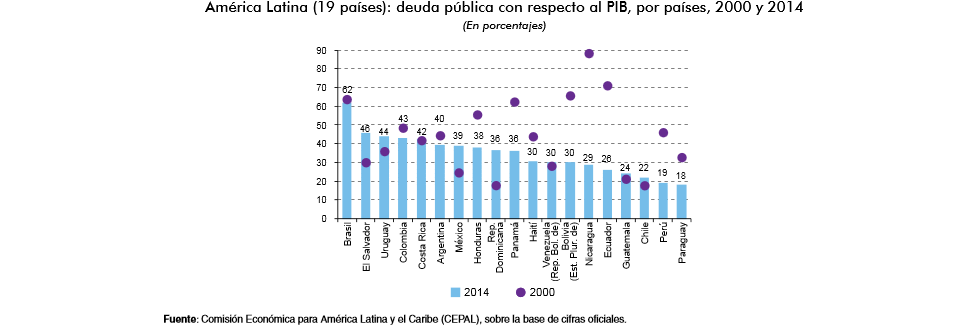 Los niveles de endeudamiento son muy disímiles entre países. Brasil tiene la deuda pública más elevada de América Latina (63,5 % del PIB en 2014), aunque en términos de deuda neta el monto es muy inferior. Otros países de América del Sur (Uruguay, Colombia y Argentina) y algunos de Centroamérica (El Salvador, Costa Rica, Honduras, República Dominicana y Panamá), así como México, tienen niveles de endeudamiento moderados (entre 36 % y 44 % del PIB). En el otro extremo, con niveles inferiores a 22 % del PIB, se encuentran Chile, Perú y Paraguay.